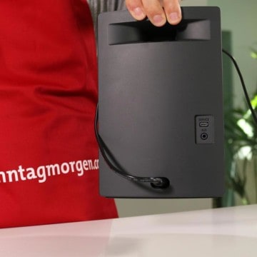 Für das Geld bekommt ihr einen schwarzen oder weißen Kubus (wir haben Schwarz genommen), der mit 1,3 Kilogramm nicht gerade nach Mobilität schreit, dieses Gewicht aber angenehm und vor allem standfest verteilt.