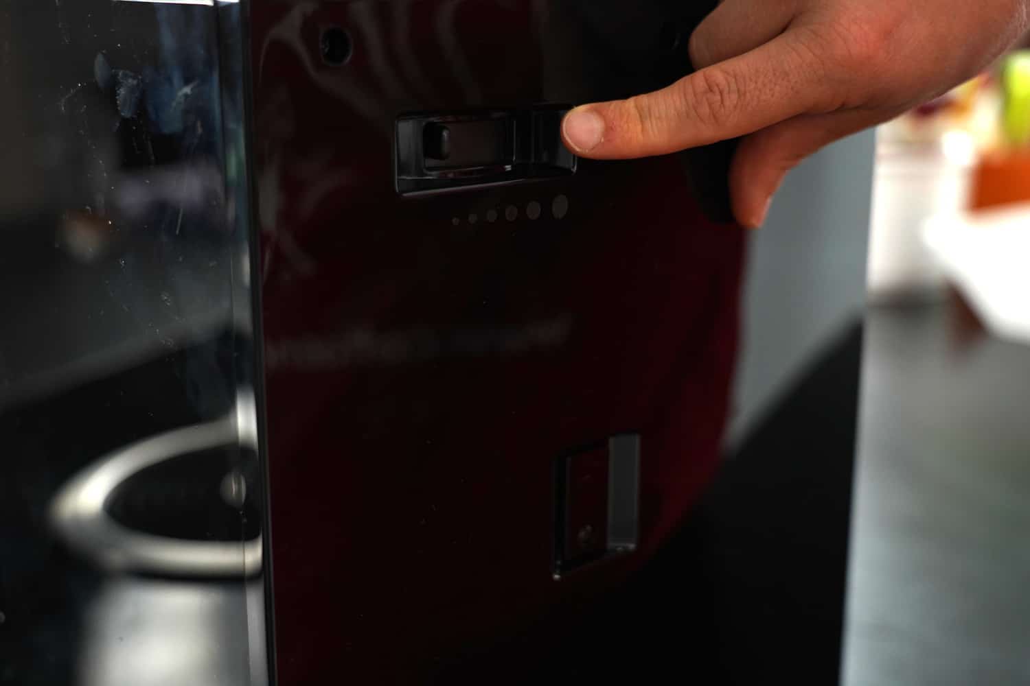 Der Mahlgrad wird auf der Rückseite der Maschine verstellt. Ihr müsst den ganzen Automaten also jedes Mal abziehen, wenn ihr den Mahlgrad ändern wollt. Ich habe ihn auf Eins gelassen. Das ist erstens der einzig wahre Mahlgrad für einen Espresso und spart mir zweitens Arbeit.