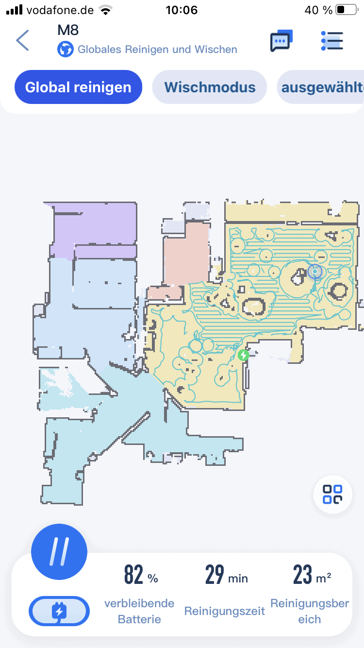 Die Akku-Laufzeit wird vom Hersteller mit maximal 120 Minuten angegeben. In unserem Test hat sich diese Angabe bestätigt. Unsere Test-Wohnung hat 73 Quadratmeter, die von der Raumerkennung des M8 korrekt erfasst wurden.